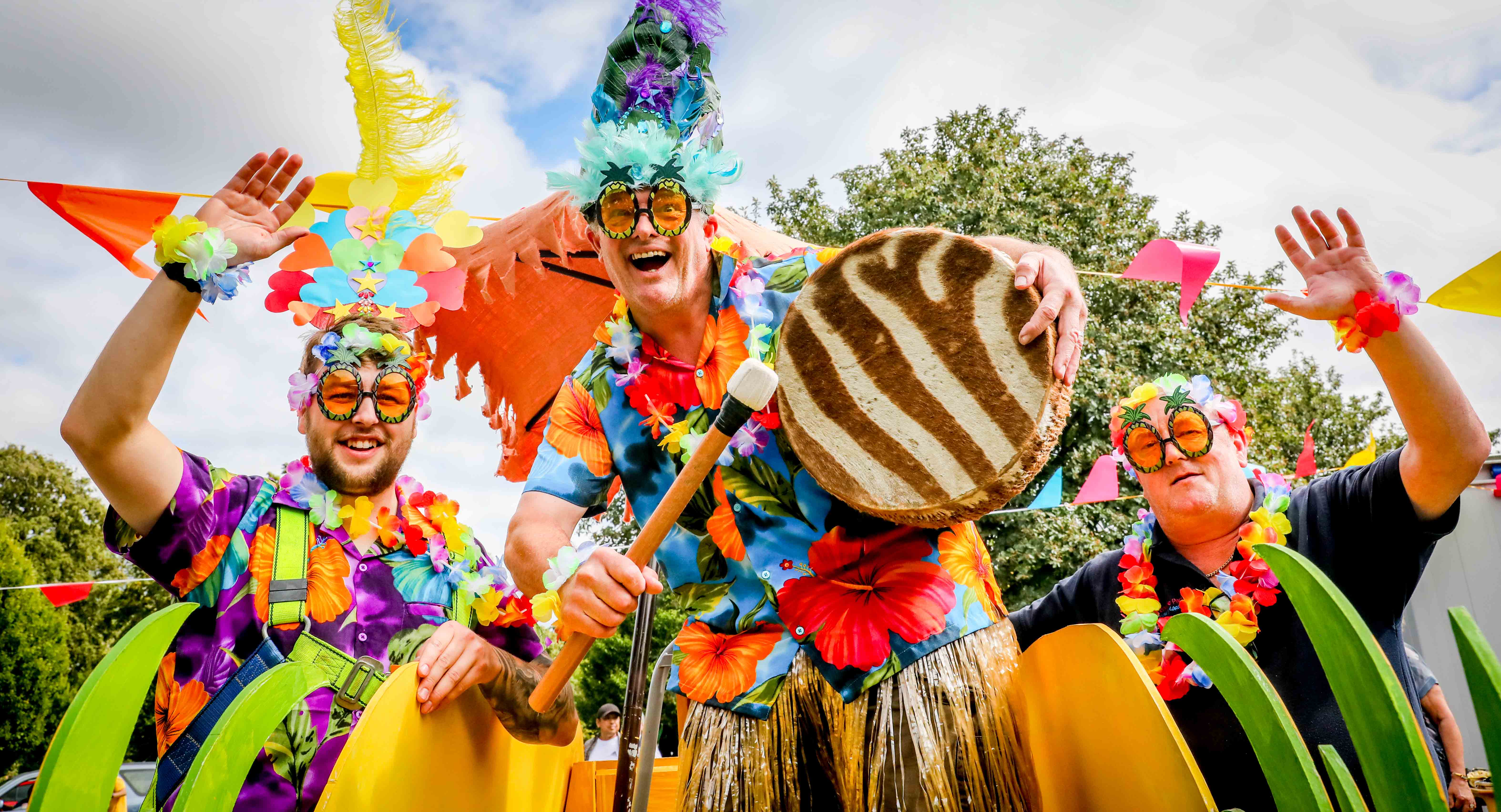 Maintenance team leader and carnival king Paul Morris led the fanfare by enthusiastically playing a giant djembe drum as he rode on the float.
