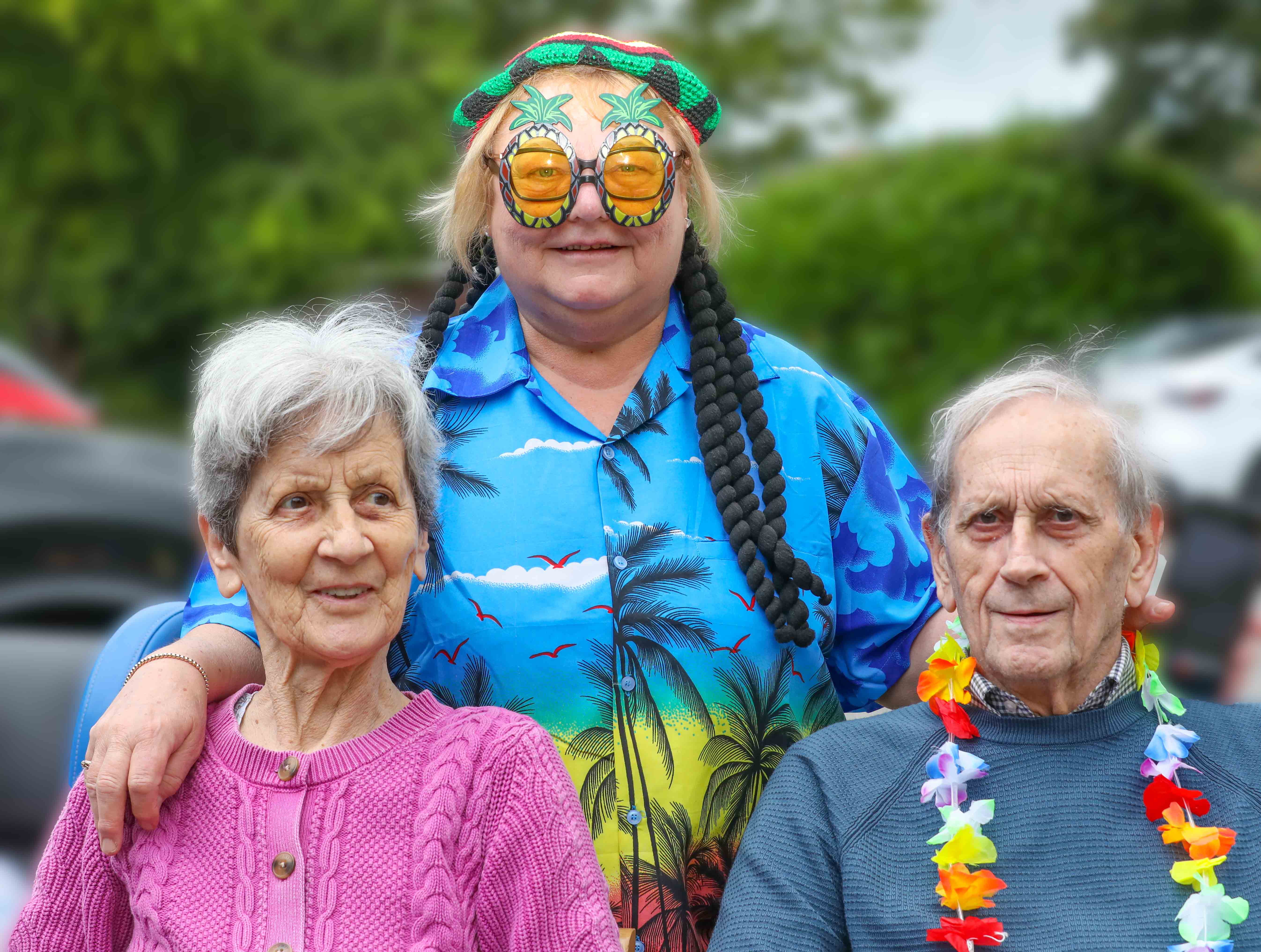 The sun came out and uplifting music resounded from the dazzling cavalcade as it stopped off at each of Pendine's care homes in Summerhill, before drawing up in a bunting festooned courtyard for a Club Tropicana Carnival-themed festivities.