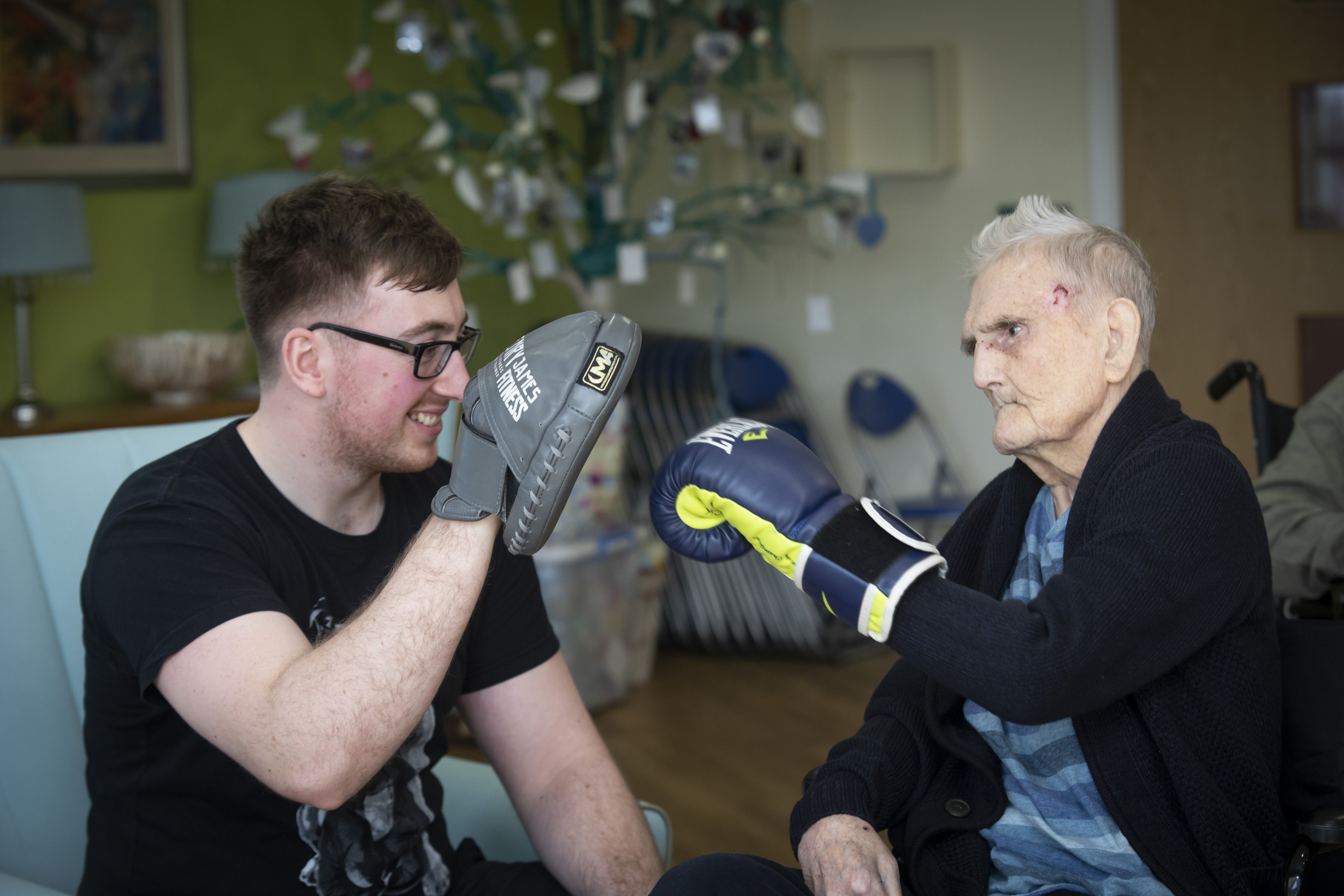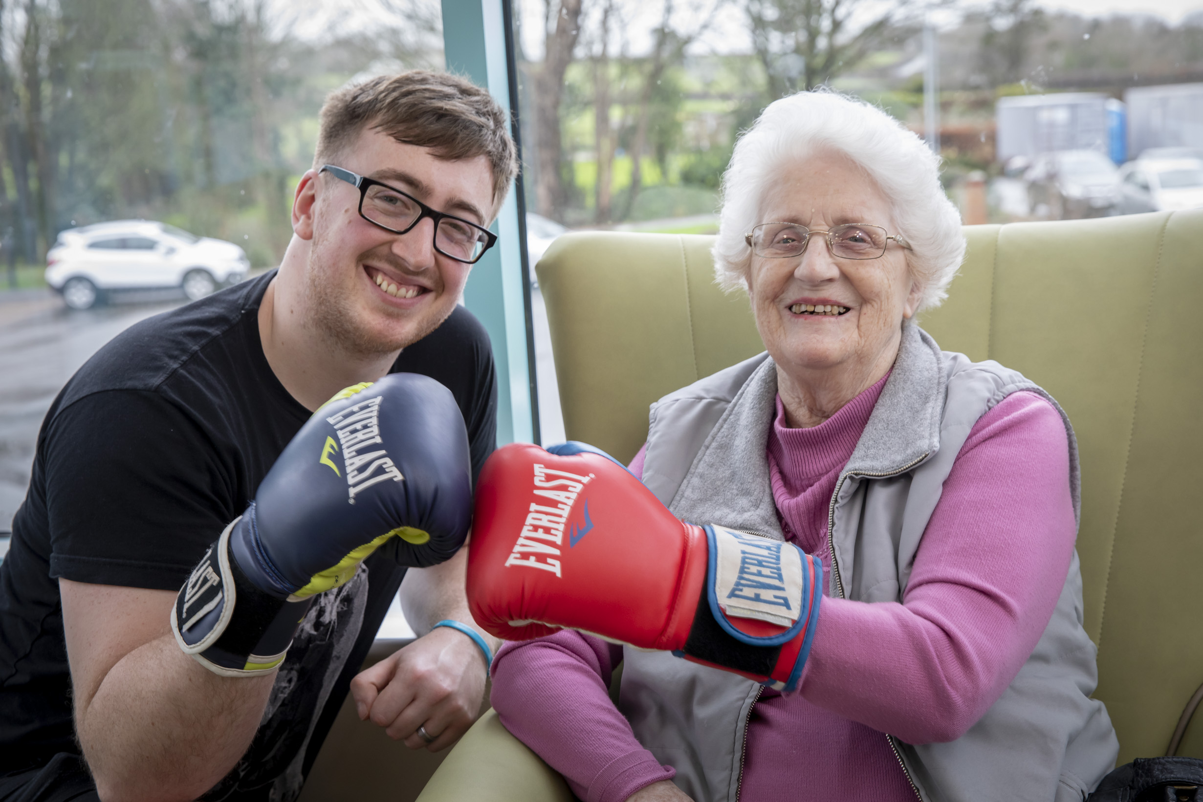 It was seconds out, round one as residents and staff of a Caernarfon care home showed off their hooks and jabs with a boxing fitness coach who has worked with top actors and sports stars including former Formula One champion Jenson Button in a Los Angeles gym.