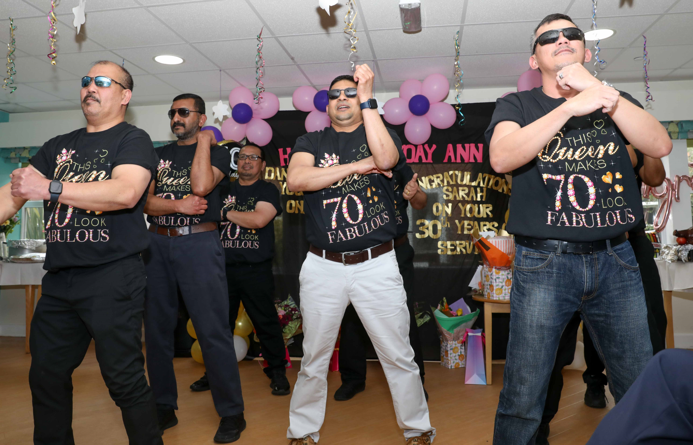 Among the surprise celebratory activities were musical numbers by the Bodlondeb staff choir, which also included two singing residents Edwin Roberts and Jim Jarvis. Care practitioners Ma. Sheena and Udani Miranda performed a duet, and a number of carers also performed joyful dances, including a traditional Filipino national dance, and a fun routine to Abba's hit Dancing Queen.