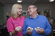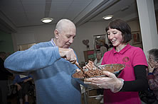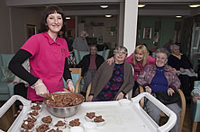 Ceri Belshaw from Denbigh chocolate shop watched by residents Annice Thomas and Betty Coggins with Susie Owen, Pendine Park